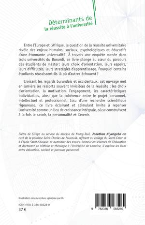 Entre l'Europe et l'Afrique, la question de la réussite universitaire révèle des enjeux humains, sociaux, psychologiques et éducatifs d'une étonnante universalité. À travers une enquête menée dans trois universités du Burundi, ce livre plonge au coeur du parcours des étudiants de master: leurs choix d'orientation, leurs espoirs, leurs difficultés, leurs stratégies d'apprentissage. Pourquoi certains étudiants réussissent-ils là où d'autres échouent ? Croisant les regards burundais et occidentaux, cet ouvrage met en lumière les ressorts souvent invisibles de la réussite: les choix d'orientation, la motivation, l'engagement, les caractéristiques individuelles, ainsi que la cohérence entre le projet personnel, intellectuel et professionnel. Issu d'une recherche scientifique rigoureuse, ce livre éclairant et stimulant invite à repenser l'université comme un lieu de croissance intégrale, où se construisent à la fois le savoir, la personnalité et l'avenir.