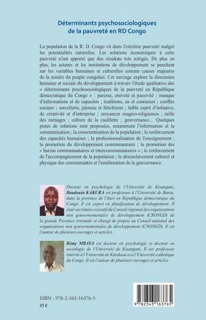La population de la R. D. Congo vit dans l'extrême pauvreté malgré les potentialités naturelles. Cet ouvrage explore la dimension humaine et sociale du développement à travers l'étude qualitative des « déterminants psychosociologiques de la pauvreté en République démocratique du Congo » : paresse, oisiveté et passivité ; manque d'informations et de capacités ; traditions, us et coutumes ; conflits sociaux ; sorcellerie, jalousie et fétichisme ; faible esprit d'initiative, de créativité et d'entreprise ; croyances magico-religieuses ; taille des ménages ; culture de la cueillette ; gouvernance... Quelques pistes de solutions sont proposées.