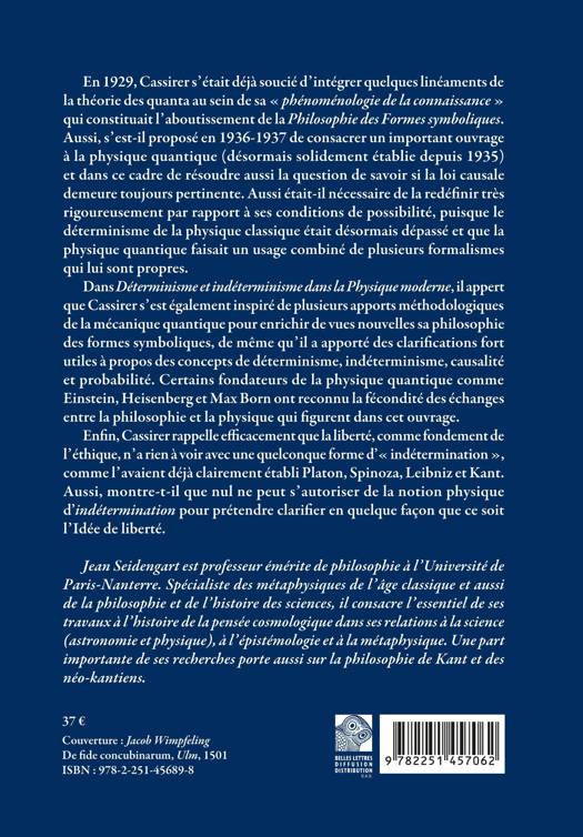 En 1929, Cassirer s'etait deja soucie d'integrer quelques lineaments de la theorie des quanta au sein de sa phenomenologie de la connaissance qui constituait l'aboutissement de la Philosophie des Formes symboliques. Aussi, s'est-il propose en 1936-1937 de consacrer un important ouvrage a la physique quantique (desormais solidement etablie depuis 1935) et dans ce cadre de resoudre aussi la question de savoir si la loi causale demeure toujours pertinente. Aussi etait-il necessaire de la redefinir tres rigoureusement par rapport a ses conditions de possibilite, puisque le determinisme de la physique classique etait desormais depasse et que la physique quantique faisait un usage combine de plusieurs formalismes qui lui sont propres. Dans Determinisme et indeterminisme dans la Physique moderne, il appert que Cassirer s'est egalement inspire de plusieurs apports methodologiques de la mecanique quantique pour enrichir de vues nouvelles sa philosophie des formes symboliques, de meme qu'il a apporte des clarifications fort utiles a propos des concepts de determinisme, indeterminisme, causalite et probabilite. Certains fondateurs de la physique quantique comme Einstein, Heisenberg et Max Born ont reconnu la fecondite des echanges entre la philosophie et la physique qui figurent dans cet ouvrage. Enfin, Cassirer rappelle efficacement que la liberte, comme fondement de l'ethique, n'a rien a voir avec une quelconque forme d' indetermination , comme l'avaient deja clairement etabli Platon, Spinoza, Leibniz et Kant. Aussi, montre-t-il que nul ne peut s'autoriser de la notion physique d'indetermination pour pretendre clarifier en quelque facon que ce soit l'Idee de liberte.