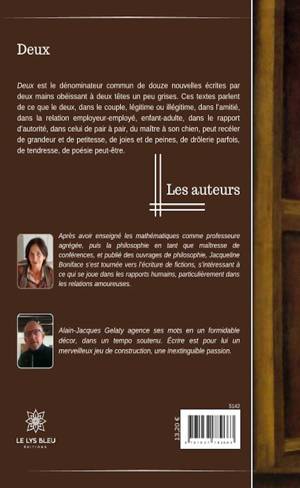 Deux est le dénominateur commun de douze nouvelles écrites par deux mains obéissant à deux têtes un peu grises. Ces textes parlent de ce que le deux, dans le couple, légitime ou illégitime, dans l'amitié, dans la relation employeur-employé, enfant-adulte, dans le rapport d'autorité, dans celui de pair à pair, du maître à son chien, peut recéler de grandeur et de petitesse, de joies et de peines, de drôlerie parfois, de tendresse, de poésie peut-être.