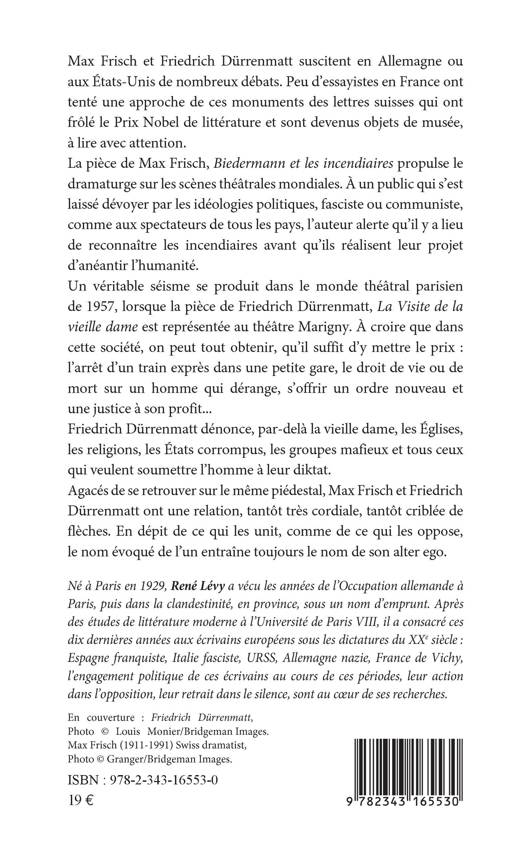 Max Frisch et Friedrich Dürrenmatt suscitent en Allemagne ou aux États-Unis de nombreux débats. Peu d'essayistes en France ont tenté une approche de ces monuments des lettres suisses qui ont frôlé le Prix Nobel de littérature et sont devenus objets de musée, à lire avec attention.