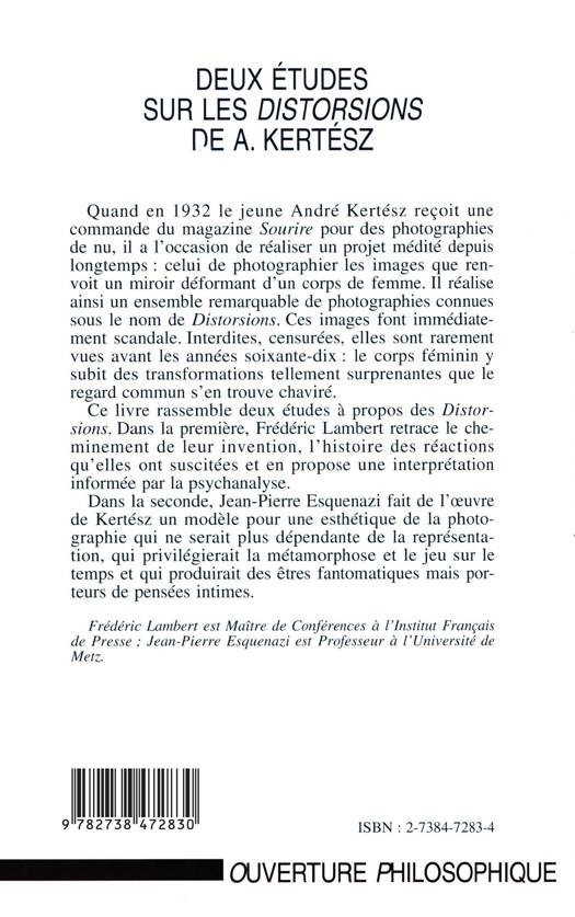 Quand en 1932 le jeune André Kertész reçoit une commande du magazine Sourire pour des photographies de nu, il a l'occasion de réaliser un projet médité depuis longtemps : photographier les images que renvoit un miroir déformant d'un corps de femme. Dans la première étude, Frédéric Lambert propose une interprétation informée par la psychanalyse. Dans la seconde, Jean-Pierre Esquenazi fait de l'œuvre de Kertész un modèle pour une esthétique de la photographie qui ne serait plus dépendante de la représentation.