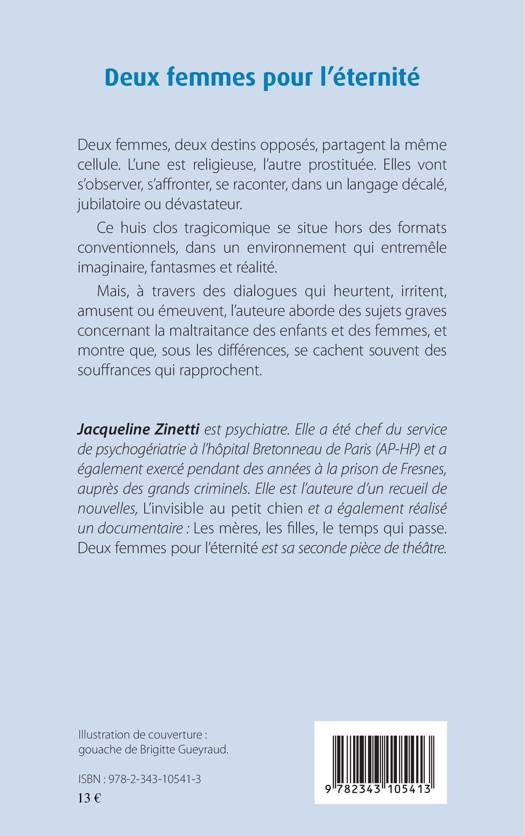 Deux femmes, deux destins opposés partagent la même cellule. L'une religieuse, l'autre prostituée, elles vont s'observer, se raconter dans un langage jubilatoire ou dévastateur. Mais dans ce huis clos tragicomique situé hors des formats conventionnels, dans un environnement entremêlant imaginaire, fantasmes et réalité, l'auteure aborde des sujets graves comme la maltraitance des enfants et des femmes, et montre que, sous les différences, se cachent souvent des souffrances qui rapprochent.