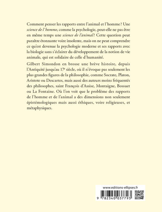 Gilbert Simondon en brosse une brève histoire, depuis l'Antiquité jusqu'au 17e siècle, où il n'évoque pas seulement les plus grandes figures de la philosophie, comme Socrate, Platon, Aristote ou Descartes, mais aussi des auteurs moins fréquentés des philosophes, saint François d'Assise, Montaigne, Bossuet ou La Fontaine. Où l'on voit que le problème des rapports de l'homme et de l'animal a des dimensions non seulement épistémologiques mais aussi éthiques, voire religieuses, et métaphysiques.
