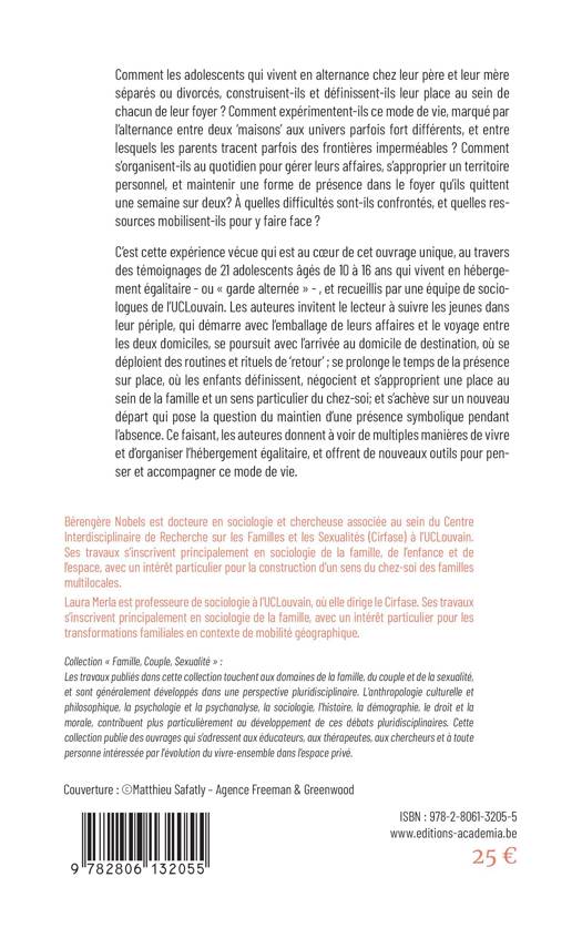 Comment les adolescents qui vivent en alternance chez leur père et leur mère séparés ou divorcés, construisent-ils et définissent-ils leur place au sein de chacun de leur foyer ? Comment expérimentent-ils ce mode de vie, marqué par l’alternance entre deux ‘maisons’ aux univers parfois fort différents, et entre lesquels les parents tracent parfois des frontières imperméables ?