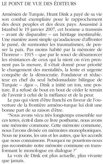 Arménien de Turquie, Hrant Dink a payé de sa vie son combat exemplaire pour le rapprochement des deux peuples et des deux pays. Assassiné à Istanbul le 19 janvier 2007, cet homme a transmis - avant de disparaître - un héritage inestimable. Une manière aussi simple qu'audacieuse d'affronter le passé, de surmonter les traumatismes, de penser la paix. Pas moins habité par la mémoire de l'horreur - 1915 - que par le souci de désamorcer les résistances de ceux qui la nient ou n'en prennent pas la mesure, il s'était donné pour priorité le changement des mentalités, la lente et urgente conquête de la démocratie. Fondateur et rédacteur en chef du seul hebdomadaire bilingue de Turquie - Agos -, Dink a initié un ton, une pos - ture. Il a refusé de bout en bout de céder le terrain de l'avenir à celui de la méfiance et de la peur. Le pas qui vient d'être franchi en faveur de l'ou - verture de la frontière arméno-turque lui doit une bonne part de sa raison d'être. "Nous avons vécu très longtemps ensemble sur ces terres, écrit- il dans ce livre posthume, nous avons une mémoire commune. Cette mémoire commune, nous l'avons divisée en mémoires monophoniques. Nous ne jouons, les uns et les autres, que les accords que nous connaissons. Pourquoi ne pourrions-nous pas reconstruire notre mémoire commune en trans - formant le monologue en dialogue ?" La voix de Dink est plus actuelle, plus vivante que jamais.