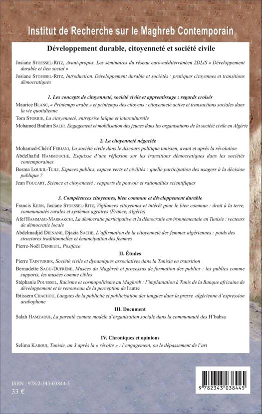 Cet ouvrage propose trois dossiers thématiques, "Les concepts de citoyenneté, société civile et apprentissage : regards croisés"; "La citoyenneté négociée" et ""Compétences citoyennes, bien commun et développement durable", suivis d'une série d'études, d'un document (La parenté comme modèle d'organisation sociale dans la communauté des H'babsa) et de la rubrique Chroniques et opinions.