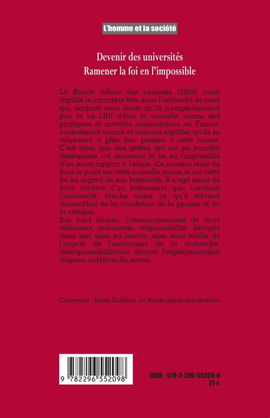 L'université et la recherche sont les points de départ de ce numéro de L'homme et la société. Université publique mise à mal aujourd'hui en France dans ce qui s'annonce comme réforme décisive. Recherche publique dont la mort est régulièrement annoncée. Une grande confusion caratérise la réception de la Loi LRU dans l'université. Ce numéro tente de faire le point sur cette nouvelle norme et sur la foi en l'impossible d'un autre rapport à l'étude, au regard de son historicité.