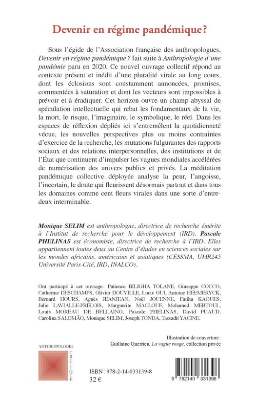 Sous l'égide de l'Association française des anthropologues, Devenir en régime pandémique ? fait suite à Anthropologie d'une pandémie paru en 2020. Ce nouvel ouvrage collectif répond au contexte présent et inédit d'une pluralité virale au long cours, dont les éclosions sont constamment annoncées, promises, commentées à saturation et dont les vecteurs sont impossibles à prévoir et à éradiquer. Cet horizon ouvre un champ abyssal de spéculation intellectuelle qui rebat les fondamentaux de la vie, la mort, le risque, l'imaginaire, le symbolique, le réel. Dans les espaces de réflexion dépliés ici s'entremêlent la quotidienneté vécue, les nouvelles perspectives plus ou moins contraintes d'exercice de la recherche, les mutations fulgurantes des rapports sociaux et des relations interpersonnelles, des institutions et de l'État que continuent d'impulser les vagues mondiales accélérées de numérisation des univers publics et privés. La méditation pandémique collective déployée analyse la peur, l'angoisse, l'incertain, le doute qui fleurissent désormais partout et dans tous les domaines comme cent fleurs virales dans une sorte d'entre-deux interminable.