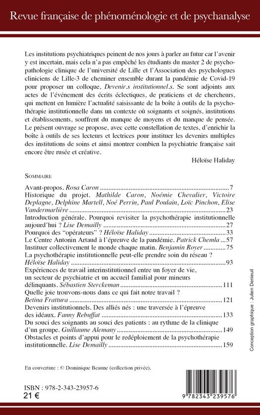Les institutions psychiatriques peinent de nos jours à parler au futur car l’avenir y est incertain, mais cela n’a pas empêché les étudiants du master 2 de psycho-pathologie clinique de l’université de Lille et l’Association des psychologues cliniciens de Lille-3 de cheminer ensemble pour proposer un colloque. Se sont adjoints aux actes de l’événement des écrits de praticiens et de chercheurs, qui mettent en lumière l’actualité saisissante de la boîte à outils de la psycho-thérapie institutionnelle dans un contexte où soignants, soignés puis institutions souffrent du manque de moyens. Le présent ouvrage se propose de montrer combien la psychiatrie française sait encore être rusée et créative.