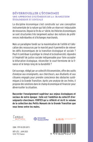 Cet ouvrage, rédigé par un collectif d'économistes, offre des outils d'analyse aux enseignants, aux chercheurs, aux étudiants et aux citoyens engagés pour prendre conscience des obstacles systémiques à la Grande Transition. Après une analyse de ces freins, il propose des solutions dans le champ économique et financier pour déverrouiller la situation.