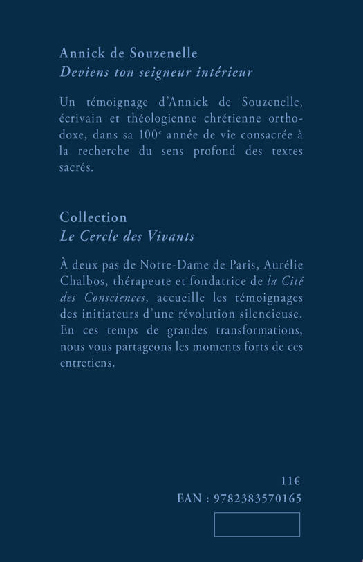 La collection "Le Cercle des Vivants" : A deux pas de Notre-Dame de Paris, Aurélie Chalbos, thérapeute et fondatrice de la Cité des Consciences, accueille les témoignages des initiateurs d'une révolution silencieuse. Dans cette collection nous en publions des moments précieux qui peuvent nous inspirer en ces temps de grandes transformations. Le livre : Lorsqu'une centenaire évoque l'amour, cela résonne autrement que dans la bouche d'un jeune adulte. Annick de Souzenelle est déterminée à ouvrir le chemin vers l'amour, vers la plus haute spiritualité. Ce chemin nous plonge à l'intérieur de nous-même. Ce témoignage d'une vie entière d'Annick de Souzenelle est un encouragement inestimable pour trouver son chemin dans une société qui perd ses anciens repères.