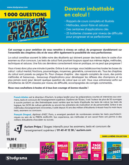 Grâce à cet ouvrage, vous (re)découvrirez toutes les bases du calcul : calcul mental, fractions, pourcentages, moyennes, géométrie, conversions, etc. Tous les chapitres du calcul sont passés au peigne fin. Pour chaque chapitre : des rappels complets de cours, des points méthodes et beaucoup... beaucoup d'applications pour développer les réflexes de champions et ne plus jamais avoir peur devant quelque question de calcul que ce soit. Vous vous entrainerez enfin sur 25 batteries de QCM classées par niveau de difficulté, accompagnées de corrigés commentés.