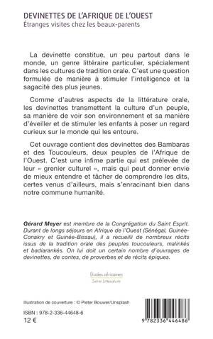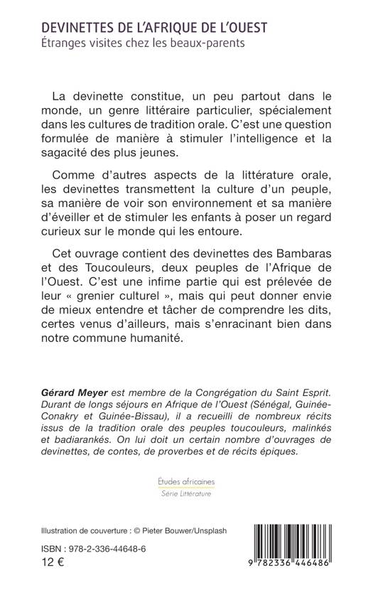 La devinette constitue, un peu partout dans le monde, un genre littéraire particulier, spécialement dans les cultures de tradition orale. C’est une question formulée de manière à stimuler l’intelligence et la sagacité des plus jeunes. Comme d’autres aspects de la littérature orale, les devinettes transmettent la culture d’un peuple, sa manière de voir son environnement et sa manière d’éveiller et de stimuler les enfants à poser un regard curieux sur le monde qui les entoure. Cet ouvrage contient des devinettes des Bambaras et des Toucouleurs, deux peuples de l’Afrique de l’Ouest. C’est une infime partie qui est prélevée de leur «  grenier culturel  », mais qui peut donner envie de mieux entendre et tâcher de comprendre les dits, certes venus d’ailleurs, mais s’enracinant bien dans notre commune humanité.