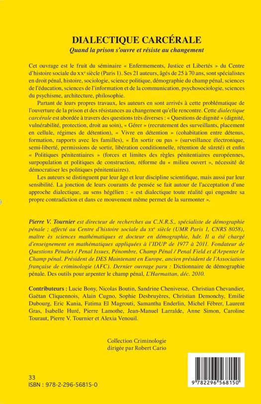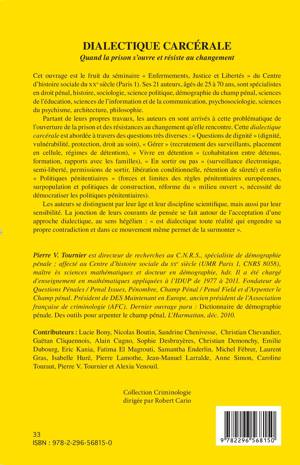 Cet ouvrage, pluridisciplinaire, s'intéresse à la problématique de l'ouverture de la prison et des résistances au changement qu'elle rencontre. Cette dialectique carcérale est abordée à travers les thématiques : "questions de dignité", "gérer", "vivre en détention", "en sortir ou pas", et "politiques pénitentiaires".
