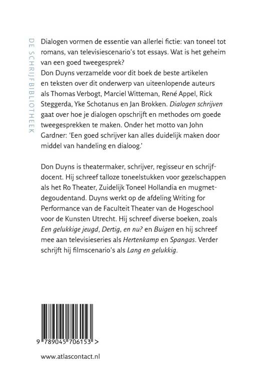'Dialogen schrijven' van Don Duyns gaat over hoe je dialogen opschrijft en over methodes om goede tweegesprekken te maken. Onder het motto van John Gardner: 'Een goed schrijver kan alles duidelijk maken door middel van handeling en dialoog.' Dialogen vormen de essentie van allerlei fictie: van toneel tot romans, van televisiescenario's tot essays. Wat is het geheim van een goed tweegesprek? Duyns verzamelde voor dit boek de beste artikelen en teksten over dit onderwerp van uiteenlopende auteurs als Thomas Verbogt, Marciel Witteman, René Appel, Rick Steggerda, Yke Schotanus en Jan Brokken.