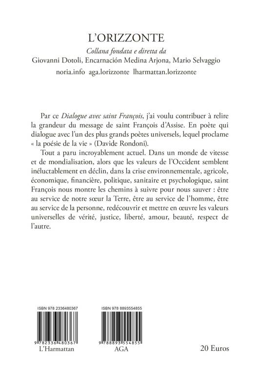 Saint François nous fait comprendre avec douceur que les droits universels n’ont pas de hiérarchie, pourvu qu’ils suivent la lignée de la miséricorde, de la pauvreté, de la pénitence et de l’amour de Dieu et de la Création. Il nous dit de transformer avant tout nous-mêmes, de changer le monde, par une révolution intérieure, fondée sur la parole de Dieu, et cela avant la révolution scientifique, de plus en plus dangereusement intrusive, et en éloignant dans chacun de nos actes la quantification matérielle de la vie. Il faut un nouvel équilibre qui parte de l’homme, de son âme, de son être, de son cœur. Le « rebelle » François est l’homme le plus doux de l’histoire, dans le sillage du « projet évangélique du Christ » (Enzo Fortunato). Relisons les textes du Pauvre d’Assise, pour trouver nous aussi la voie du Seigneur : celle de la foi, de la Parole, de la miséricorde, du bleu du ciel étoilé qui lui est si cher. Nous aussi, nous deviendrons meilleurs, et peut-être un peu comme Lui. Par ce Dialogue avec saint François, j’ai voulu contribuer à relire la grandeur du message Saint François d’Assise. En poète qui dialogue avec l’un des plus grands poètes universels, lequel proclame « la poésie de la vie » (Davide Rondoni). Tout a paru incroyablement actuel. Dans un monde de vitesse et de mondialisation, alors que les valeurs de l’Occident semblent inéluctablement en déclin, dans la crise environnementale, agricole, économique, financière, politique, sanitaire et psychologique, saint François nous montre les chemins à suivre pour nous sauver : être au service de notre sœur la Terre, être au service de l’homme, être au service de la personne, redécouvrir et mettre en œuvre les valeurs universelles de vérité, justice, liberté, amour, beauté, respect de l’autre.