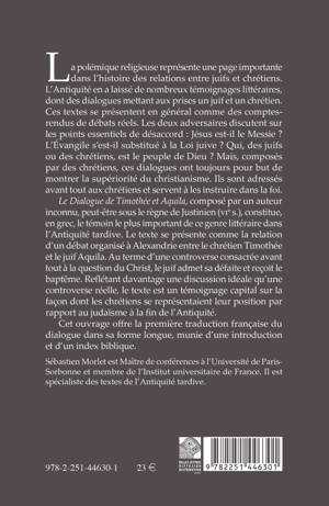 La polemique religieuse represente une page importante dans l'histoire des relations entre juifs et chretiens. L'Antiquite en a laisse de nombreux temoignages litteraires, dont des dialogues mettant aux prises un juif et un chretien. Ces textes se presentent en general comme des compte rendus de debats reels. Les deux adversaires discutent sur les points essentiels de desaccord: Jesus est-il le Messie? L'Evangile s'est-il substitue a la Loi juive? Qui, des juifs ou des chretiens, est le peuple de Dieu? Mais, composes par des chretiens, ces dialogues ont toujours pour but de montrer la superiorite du christianisme. Ils sont adresses avant tout aux chretiens et servent a les instruire dans la foi.Le Dialogue de Timothee et Aquila, compose par un auteur inconnu, peut-etre sous le regne de l'empereur byzantin Justinien (VIe s.), constitue, en grec, l'un des temoins les plus importants de ce genre litteraire dans l'Antiquite tardive. Ce texte se presente comme la relation d'un debat organise a Alexandrie entre le chretien Timothee et le juif Aquila. Au terme d'une controverse consacree avant tout a la question du Christ, le juif admet sa defaite et recoit le bapteme. Refletant davantage une discussion ideale qu'une controverse reelle, ce texte est un temoignage capital sur la facon dont les chretiens se representaient leur position par rapport au judaisme dans les derniers temps de l'Empire romain.Cet ouvrage offre la premiere traduction francaise du dialogue dans sa forme longue.