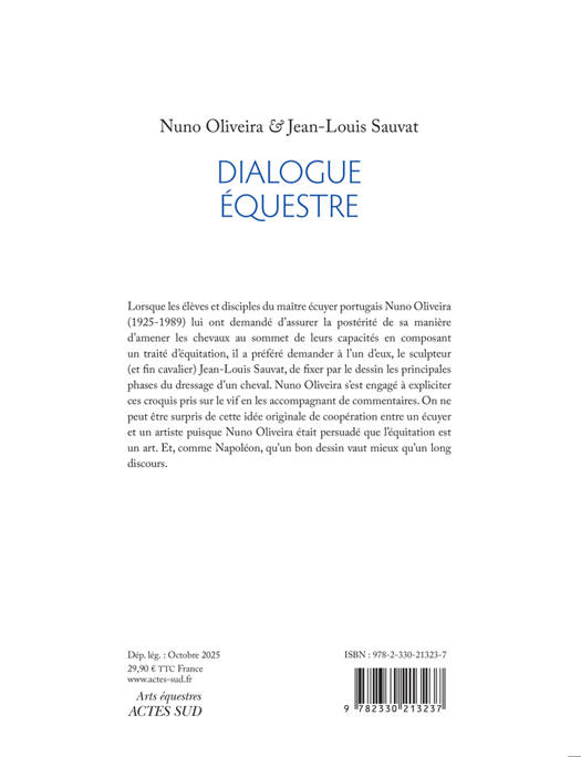 Lorsque les élèves et disciples du maître écuyer portugais Nuno Oliveira (1925-1989) lui ont demandé d'assurer la postérité de sa manière d'amener les chevaux au sommet de leurs capacités en composant un traité d'équitation, il a préféré demander à l'un d'eux, le sculpteur (et fin cavalier) Jean-Louis Sauvat, de fixer par le dessin les principales phases du dressage d'un cheval. Nuno Oliveira s'est engagé à expliciter ces croquis pris sur le vif en les accompagnant de commentaires. On ne peut être surpris de cette idée originale de coopération entre un écuyer et un artiste puisque Nuno Oliveira était persuadé que l'équitation est un art. Et, comme Napoléon, qu'un bon dessin vaut mieux qu'un long discours.