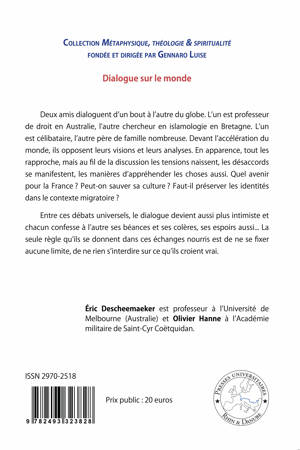 Deux amis dialoguent d’un bout à l’autre du globe. L’un est professeur de droit en Australie, l’autre chercheur en islamologie en Bretagne. L’un est célibataire, l’autre père de famille nombreuse. Devant l’accélération du monde, ils opposent leurs visions et leurs analyses. En apparence, tout les rapproche, mais au fil de la discussion les tensions naissent, les désaccords se manifestent, les manières d’appréhender les choses aussi. Quel avenir pour la France ? Peut-on sauver sa culture ? Faut-il préserver les identités dans le contexte migratoire ? Entre ces débats universels, le dialogue devient aussi plus intimiste et chacun confesse à l’autre ses béances et ses colères, ses espoirs aussi... La seule règle qu’ils se donnent dans ces échanges nourris est de ne se fixer aucune limite, de ne rien s’interdire sur ce qu’ils croient vrai.