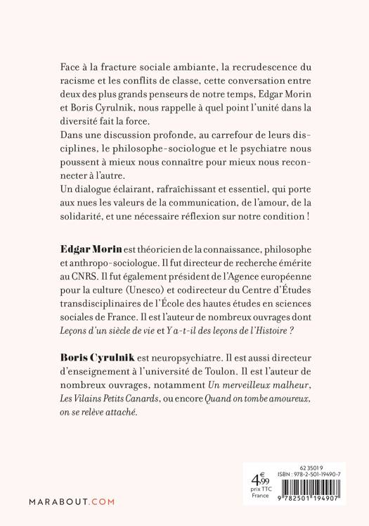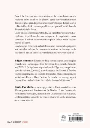 Face à la fracture sociale ambiante, la recrudescence du racisme et les conflits de classe, cette conversation entre deux des plus grands penseurs de notre temps, Edgar Morin et Boris Cyrulnik, nous rappelle à quel point l’unité dans la diversité fait la force.