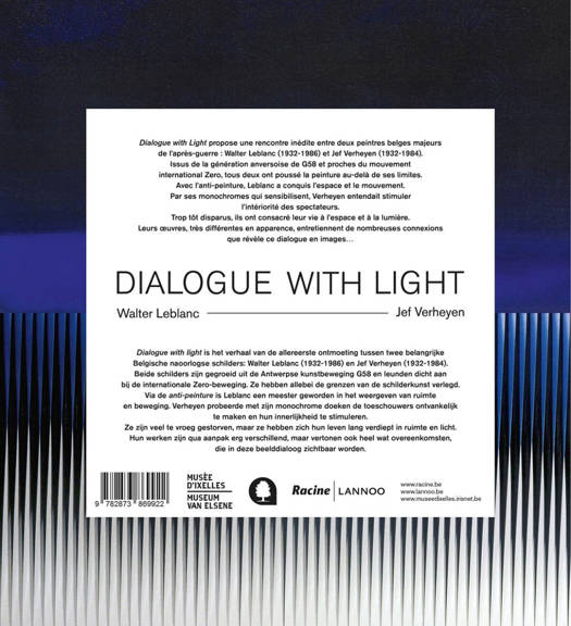 Dialogue with Light propose une rencontre inédite entre deux peintres belges majeurs de l'après-guerre : Walter Leblanc (1932-1986) et Jef Verheyen (1932-1984). Issus de la génération anversoise de G58 et proches du mouvement international Zero, tous deux ont poussé la peinture au-delà de ses limites. Avec l'anti-peinture, Leblanc a conquis l'espace et le mouvement. Par ses monochromes qui sensibilisent, Verheyen entendait stimuler l'intériorité des spectateurs. Trop tôt disparus, ils ont consacré leur vie à l'espace et à la lumière. Leurs oeuvres, très différentes en apparence, entretiennent de nombreuses connexions que révèle ce dialogue en images...