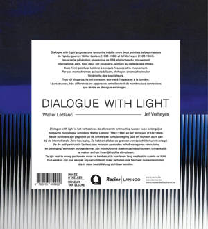 Dialogue with light is het verhaal van de allereerste ontmoeting tussen twee belangrijke Belgische naoorlogse schilders : Walter Leblanc (1932-1986) en Jef Verheyen (1932-1984). Beide schilders zijn gegroeid uit de Antwerpse kunstbeweging G58 en leunden dicht aan bij de internationale Zero-beweging. Ze hebben allebei de grenzen van de schilderkunst verlegd. Via de anti-peinture is Leblanc een meester geworden in het weergeven van ruimte en beweging. Verheyen probeerde met zijn monochrome doeken de toeschouwers ontvankelijk te maken en hun innerlijkheid te stimuleren. Ze zijn veel te vroeg gestorven, maar ze hebben zich hun leven lang verdiept in ruimte en licht. Hun werken zijn qua aanpak erg verschillend, maar vertonen ook heel wat overeenkomsten, die in deze beelddialoog zichtbaar worden.