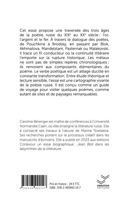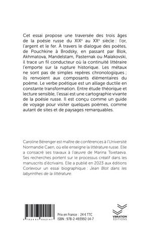 Cet essai propose une traversée des trois âges de la poésie russe du XIXe au XXe siècle : l’or, l’argent et le fer. À travers le dialogue des poètes, de Pouchkine à Brodsky, en passant par Blok, Akhmatova, Mandelstam, Pasternak ou Maïakovski, il trace un fil conducteur où la continuité littéraire l’emporte sur la rupture historique. Les métaux ne sont pas de simples repères chronologiques ; ils renvoient aux composants élémentaires du poème. Le verbe poétique est un alliage ductile en constante transformation. Entre étude théorique et lecture sensible, l’essai est une cartographie vivante de la poésie russe. Il est conçu comme un guide de voyage pour visiter quelques poèmes, comme autant de sites et de paysages remarquables.