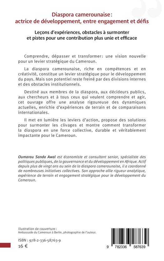 Comprendre, dépasser et transformer une vision nouvelle pour un levier stratégique du Cameroun. La diaspora camerounaise, riche en compétences et en créativité, constitue un levier stratégique pour le développement du pays. Mais son potentiel reste freiné par des divisions internes et des obstacles institutionnels. Destiné aux membres de la diaspora, aux décideurs publics, aux chercheurs et à tous ceux qui veulent comprendre et agir, cet ouvrage offre une analyse rigoureuse des dynamiques actuelles, enrichie d'expériences de terrain et de comparaisons internationales. Il met en lumière les leviers d'action, propose des solutions pour surmonter les clivages et montre comment transformer la diaspora en une force collective, durable et véritablement impactante pour le Cameroun.