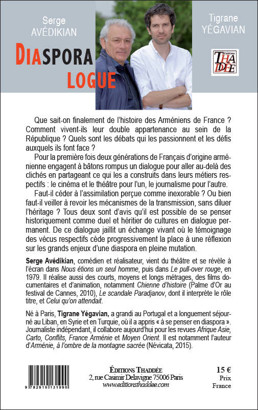Que sait-on finalement de l’histoire des Arméniens de France ? Comment vivent-ils leur double appartenance au sein de la République ? Quels sont les débats qui les passionnent et les défis auxquels ils font face ? Pour la première fois deux générations de Français d’origine arménienne engagent à bâtons rompus un dialogue pour aller au-delà des clichés en partageant ce qui les a construits dans leurs métiers respectifs : le cinéma et le théâtre pour l’un, le journalisme pour l’autre. Faut-il céder à l’assimilation perçue comme inexorable ? Ou bien faut-il veiller à revoir les mécanismes de la transmission, sans diluer l’héritage ? Tous deux sont d’avis qu’il est possible de se penser historiquement comme duel et héritier de cultures en dialogue permanent. De ce dialogue jaillit un échange vivant où le témoignage des vécus respectifs cède progressivement la place à une réflexion sur les grands enjeux d’une diaspora en pleine mutation.