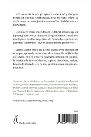 Simon Martin scrute les petites choses avec étonnement et les partage en de savoureuses chroniques. Il « célèbre » les diatomées, et bien d’autres curiosités, notamment les noix, la musique de Sainte-Colombe, la pluie, l’hellébore, le tigre, l’atelier de Morandi. « Ce ne sont pas les mots qui manquent », nous dit-il.