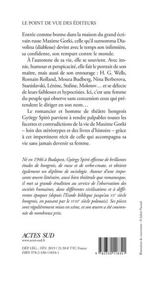 Le romancier et homme de théâtre hongrois György Spiró parvient à rendre palpables toutes les facettes et contradictions de la vie de Maxime Gorki - loin des stéréotypes et des livres d'histoire - grâce à cet impertinent récit de celle qui accompagna sa vie sans jamais devenir sa femme.