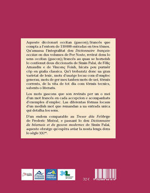 Aqueste diccionari occitan (gascon) / francés que compta a l’entorn de 110 000 entradas en tres tòmes. Qu’amassa l’integralitat deu Dictionnaire français-occitan en dus volumes de Per Noste, revirat dens lo sens occitan (gascon) / francés au quau se horneish lo contienut deus diccionaris de Simin Palai, de Fèliç Arnaudin e de Vincenç Foish, hicats peu purmèr còp en grafia classica. Qu’i trobaratz donc ua gran varietat de lexic, mots d’usatge locau com d’emplec generau, mots de ger mes tanben mots de uei, tèrmis corrents, de la vita de tot dia com tèrmis tecnics, sabents o literaris. Los mots gascons que son revirats per un o mei d’un mot francés en cada accepcion e acompanhats d’exemples d’emplec. Las diferentas fòrmas locaus d’un medish mot que remandan a ua entrada unica qui detalha los sens. D’un endom comparable au Tresor dóu Felibrige de Frederic Mistral, e passant lo deu Dictionnaire du béarnais et du gascon modernes de Simin Palai, aqueste obratge qu’espèra aviar la nosta lenga dens lo sègle XXIau.