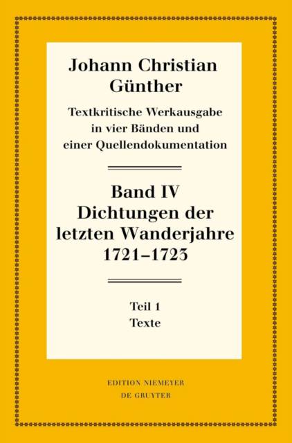 Der vierte Band von Günthers Werken ist erstaunlich umfangreich: Aus den letzten 21 Lebensmonaten des Dichters sind 196 Gedichte, Briefe und Entwürfe überliefert. In Jauer, Liegnitz, Goldberg und vor allem in den schlesischen Gebirgsstädten Hirschberg, Schmiedeberg und Landeshut fand Günther neue Gönner und Freunde, Aufträge und Gelegenheiten, sich als Dichter zu bewähren und für Gastfreundschaft und Unterstützung zu danken. Dabei entstanden in geselligem Kreis neue Spottverse, in frommer Umgebung viele Geistliche Gedichte und der berühmte Rechtfertigungsbrief an den Vater. In Sporcks Kukusbad erblühte nochmals Panegyrik, in Jena bis zuletzt launige Hochzeitsdichtung. Trotz Krankheit und Erschöpfung konnte Günther sein poetisches Standesbewußtsein, seine Rolle eines Poeta doctus und sein Talent als witziger Sprachkünstler erhalten, wie das letzte Bitt-Billet an seinen Gastgeber von Eben zeigt.