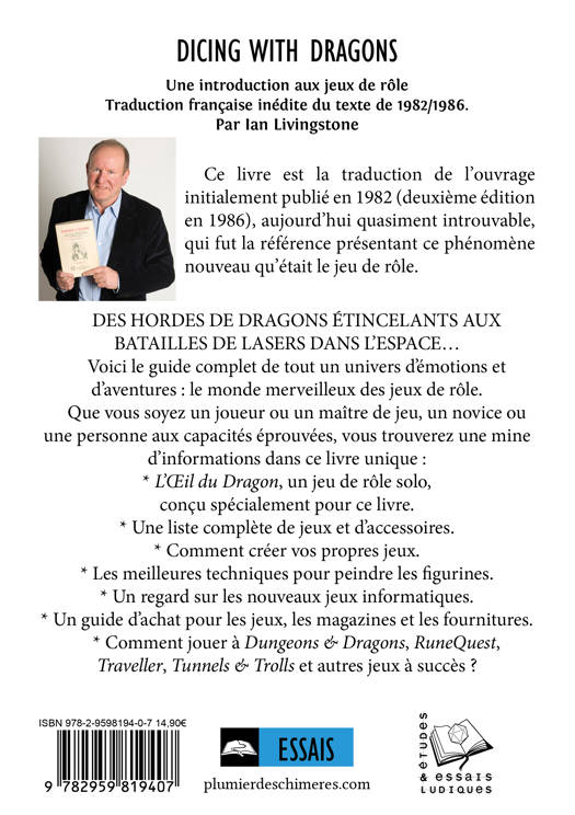 Ce livre est la traduction de l’ouvrage initialement publié en 1982 (deuxième édition en 1986), aujourd’hui quasiment introuvable, qui fut la référence présentant ce phénomène nouveau qu’était le jeu de rôle. DES HORDES DE DRAGONS ÉTINCELANTS AUX BATAILLES DE LASERS DANS L’ESPACE… Voici le guide complet de tout un univers d’émotions et d’aventures : le monde merveilleux des jeux de rôle. Que vous soyez un joueur ou un maître de jeu, un novice ou une personne aux capacités éprouvées, vous trouverez une mine d’informations dans ce livre unique : * L’Œil du Dragon, un jeu de rôle solo, conçu spécialement pour ce livre. * Une liste complète de jeux et d’accessoires. * Comment créer vos propres jeux. * Les meilleures techniques pour peindre les figurines. * Un regard sur les nouveaux jeux informatiques. * Un guide d’achat pour les jeux, les magazines et les fournitures. * Comment jouer à Dungeons & Dragons, RuneQuest, Traveller, Tunnels & Trolls et autres jeux à succès ?
