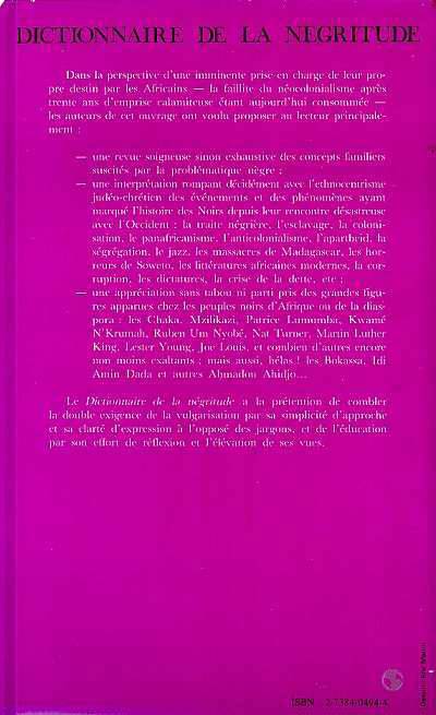 Dans la perspective d’une imminente prise en charge de leur propre destin par les africains- la faillite du néocolonialisme après trente ans d’emprise calamiteuse étant aujourd’hui consommée, les auteurs de cet ouvrage propose une interprétation rompant décidément avec l’ethnocentrisme judéo-chrétiennes événements et des phénomènes ayant marqué l’histoire des noires depuis leur rencontre avec l’occident. Ils proposent également une appréciation dans tabou, ni parti pris des grandes figures apparues chez les peuples noirs..