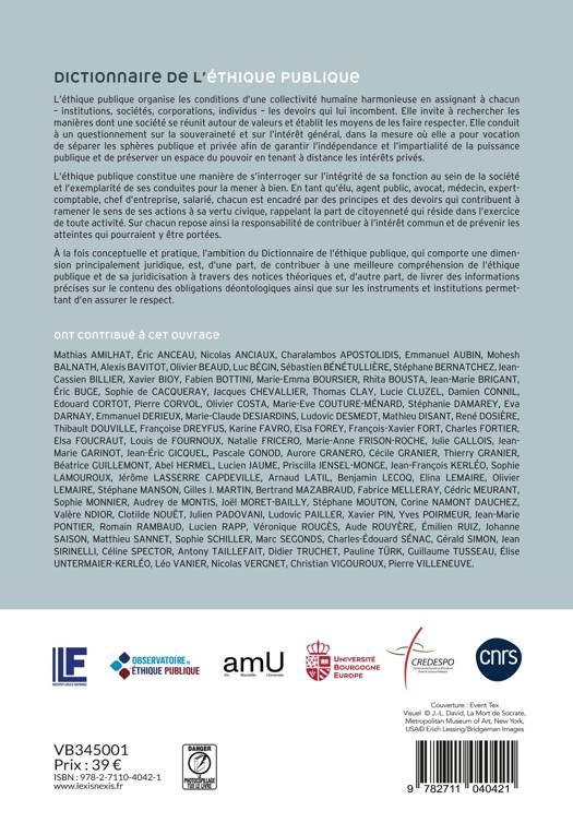 Dans un contexte de très forte progression, depuis 2013, des problématiques liées à l'éthique et de la naissance d'une véritable culture de la déontologie et de la transparence, ce dictionnaire de type encyclopédique sera le premier ouvrage juridique global consacré à l'éthique publique et à l'éthique des affaires. L'ouvrage rassemble des notices principalement rédigées par des universitaires juristes, dans la perspective d'offrir une étude de l'ensemble des thématiques de l'éthique publique et des affaires. Il comprend une dimension tant théorique (à travers notamment des entrées consacrées aux grands concepts de l'éthique (déontologie, éthique, compliance, transparence, etc.) et à ses penseurs (Bentham, Rousseau) que pratique (avec des notices comme conflit d'intérêts, déclaration de patrimoine, mandat financier, ou encore déport, récusation). Dans ces circonstances, il s'adresse tant au monde académique (enseignants, chercheurs et étudiants), qu'aux responsables publics (élus et fonctionnaires) et du monde des affaires.
