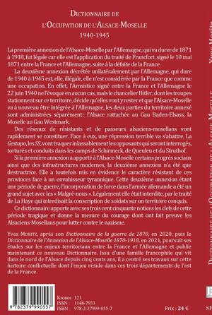La première annexion de l'Alsace-Moselle par l'Allemagne, de 1871 à 1918, fut légale car elle est l'application du traité de Francfort, signé le 10 mai 1871. La deuxième annexion décrétée unilatéralement par l'Allemagne, de 1940 à 1945 est, elle, illégale, elle n'est considérée par la France que comme une occupation. L'Armistice signé entre la France et l'Allemagne le 22 juin 1940 ne l'évoque en aucun cas, mais le chancelier Hitler décide que l'Alsace-Moselle va à nouveau être intégrée à l'Allemagne; les deux parties du territoire annexé sont administrées séparément: l'Alsace rattachée au Gau Baden-Elsass, la Moselle au Gau Westmark. Des réseaux de résistants et de passeurs alsaciens-mosellans vont rapidement se constituer. Face à eux, une répression terrible va s'abattre. De nombreux opposants seront interrogés, torturés et conduits dans les camps de Schirmeck, de Queuleu et du Struthof. Cette deuxième annexion étant une période de guerre, l'incorporation de force dans l'armée allemande a été un grand sujet avec les Malgré-nous . Légalement elle était interdite par le traité de La Haye qui interdisait la conscription de soldats sur un territoire conquis. Ce dictionnaire apporte avec ses trois cent cinquante notices les clefs de cette période tragique et donne la mesure du courage dont ont fait preuve les Alsaciens-Mosellans pour lutter contre le nazisme.