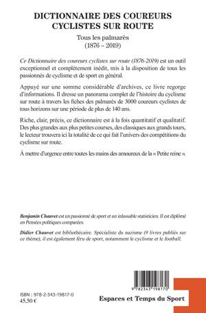 Ce dictionnaire des coureurs cyclistes sur route (1876-2019) est un outil exceptionnel et complètement inédit, mis à la disposition de tous les passionnés de cyclisme et de sport en général. Appuyé sur une somme considérable d'archives, ce livre regorge d'informations. Il dresse un panorama complet de l'histoire du cyclisme sur route à travers les fiches des palmarès de 3 000 coureurs cyclistes de tous horizons sur une période de plus de 140 ans. Des plus grandes aux plus petites courses, des classiques aux grands tours, le lecteur trouvera ici la totalité de ce qui fait l'univers des compétitions du cyclisme sur route.