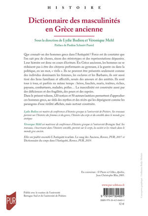 Que connaît-on des hommes grecs dans l’Antiquité ? Force est de constater que l’on sait peu de choses, sinon des stéréotypes et des représentations dépassées. Leur histoire est donc en cours d’écriture. En Grèce ancienne, les hommes ne se réduisent pas à être des citoyens performants au gymnase, à la guerre ou dans la politique, en un mot, « virils ». Ils ne peuvent être présentés seulement comme des individus dominants les femmes, les esclaves et les Barbares, ils ont aussi tissé des liens familiaux et affectifs, noués des amours et des amitiés. Ils sont tour à tour, et parfois en même temps : héros, fauchés, maris, traîtres, riches, paysans, combattants, malades, poilus… La masculinité est construite aussi par des déficiences et des fragilités, des peurs et des espoirs. Dans le présent volume, 120 notices et 50 auteurs/autrices permettent d’approcher ces hommes grecs, au-delà des mythes et des récits qui les dépeignent comme les parangons d’une virilité affichée, mais surtout construite.