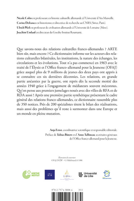Que savons-nous des relations culturelles franco-allemandes ? ARTE bien sûr, mais encore ? Ce dictionnaire informe sur les acteurs des relations culturelles bilatérales, les institutions, la nature des échanges, les circulations et les évolutions. Tout n'a pas commencé en 1963 avec le traité de l'Élysée et l'Office franco-allemand pour la Jeunesse (OFAJ) grâce auquel plus de 9 millions de jeunes des deux pays ont appris à se connaître ces six dernières décennies. Les relations, en grande partie anéanties par la guerre, ont repris dès la seconde moitié des années 1940 grâce à l'engagement de médiateurs souvent méconnus. Qu'on pense aux premiers jumelages noués avec des villes de RFA et de RDA aussi ! Après une première partie synthétique présentant le cadre général des relations franco-allemandes, ce dictionnaire rassemble plus de 350 notices. Près de 200 spécialistes tirent le bilan des réalisations, mais aussi des problèmes qu'il reste à surmonter dans une Europe et un monde en pleine mutation.