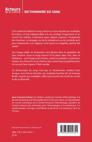 Si la médecine définit le sang comme un tissu liquide aux multiples fonctions, s'il est indispensable à la vie, protège l'organisme et en nourrit les cellules, il alimente aussi, depuis toujours, l'imaginaire des hommes. Le langage use de la métaphore ou du symbole qu'il peut représenter. Les religions l'ont honni ou magnifié, parfois fait couler. Son image réelle ou fantasmée s'est glissée dans le quotidien de tout homme. Aussi le sang trouve-t-il sa place dans l'art, dans la littérature - qu'il s'agisse de romans, contes ou poésies. La peinture, l'opéra, les chansons ou le cinéma, tout autant que la gastronomie, lui ouvrent leur espace. Il fait monde. Ce dictionnaire du sang n'est pas un dictionnaire médical mais évoque, sous forme d'articles, les multiples facettes de cet étrange fluide, exposé aux maladies, reflet tout à la fois de l'unité du vivant et de sa diversité.