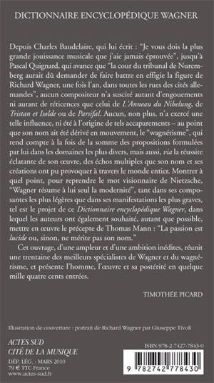 Depuis Charles Baudelaire, qui lui écrit : "Je vous dois la plus grande jouissance musicale que j'aie jamais éprouvée", jusqu'à Pascal Quignard, qui avance que "la cour du tribunal de Nuremberg aurait dû demander de faire battre en effigie la figure de Richard Wagner, une fois l'an, dans toutes les rues des cités allemandes", aucun compositeur n'a suscité autant d'engouements ni autant de réticences que celui de L'Anneau du Nibelung, de Tristan et Isolde ou de Parsifal. Aucun, non plus, n'a exercé une telle influence, ni été à l'origine de tels accaparements - au point que son nom ait été dérivé en mouvement, le "wagnérisme", qui rend compte à la fois de la somme des propositions formulées par lui dans les domaines les plus divers, mais aussi, via la réussite éclatante de son oeuvre, des échos multiples que son nom et ses créations ont pu provoquer à travers le monde entier. Montrer à quel point, pour reprendre le mot visionnaire de Nietzsche, "Wagner résume à lui seul la modernité", tant dans ses composantes les plus légères que dans ses manifestations les plus graves, tel est le projet de ce Dictionnaire encyclopédique Wagner, dans lequel les auteurs ont également souhaité, autant que possible, mettre en oeuvre le précepte de Thomas Mann : "La passion est lucide ou, sinon, ne mérite pas son nom." Cet ouvrage, d'une ampleur et d'une ambition inédites, réunit une trentaine des meilleurs spécialistes de Wagner et du wagnérisme, et présente l'homme, l'oeuvre et sa postérité en quelque mille quatre cents entrées. TIMOTHÉE PICARD