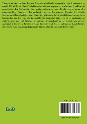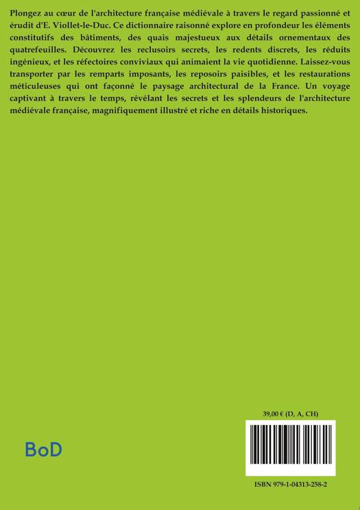 Plongez au coeur de l'architecture française médiévale à travers le regard passionné et érudit d'E. Viollet-le-Duc. Ce dictionnaire raisonné explore en profondeur les éléments constitutifs des bâtiments, des quais majestueux aux détails ornementaux des quatrefeuilles. Découvrez les reclusoirs secrets, les redents discrets, les réduits ingénieux, et les réfectoires conviviaux qui animaient la vie quotidienne. Laissez-vous transporter par les remparts imposants, les reposoirs paisibles, et les restaurations méticuleuses qui ont façonné le paysage architectural de la France. Un voyage captivant à travers le temps, révélant les secrets et les splendeurs de l'architecture médiévale française, magnifiquement illustré et riche en détails historiques.