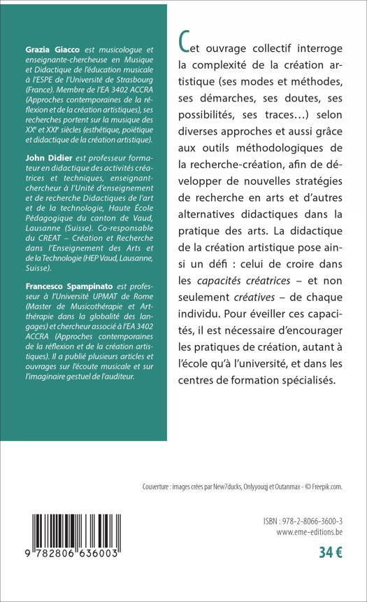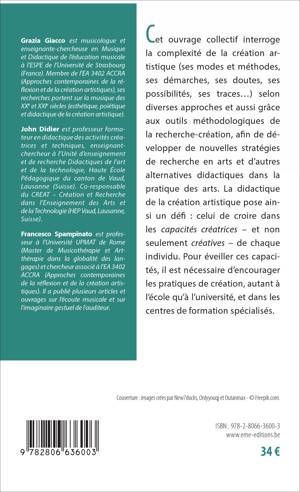 Qu'il s'agisse de recherche ou d'enseignement, la création artistique interpelle autant les théoriciens que les praticiens. Abordée selon diverses approches, la démarche de création révèle des perspectives de recherche multiples. Grâce aux contributions de plusieurs chercheurs, enseignants, artistes et médiateurs d'institutions culturelles, cet ouvrage participe à un changement de paradigme, où les rapports entre créateurs-enseignants-étudiants-chercheurs tracent désormais de nouveaux réseaux et de nouvelles perspectives.