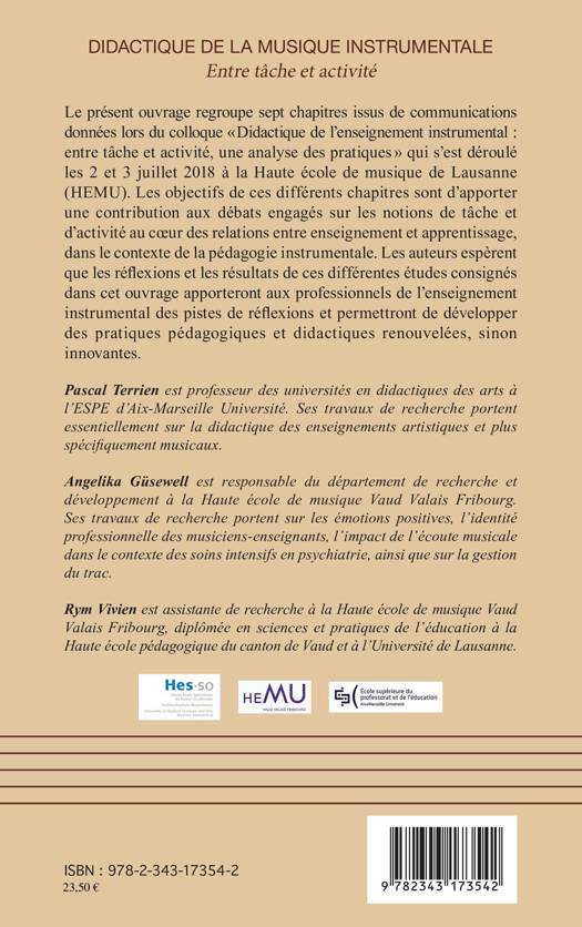 L'objectif de cet ouvrage est d'apporter une contribution aux débats engagés sur les notions de tâche et d'activité au coeur des relations entre enseignement et apprentissage, dans le contexte de la pédagogie instrumentale. Les auteurs espèrent que les résultats de ces différentes études apporteront aux professionnels de l'enseignement instrumental des pistes de réflexions et permettront de développer des pratiques pédagogiques et didactiques renouvelées, sinon innovantes.