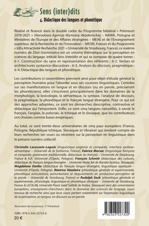 Les contributions ci-rassemblées prennent ainsi pour objet d’étude général la perception humaine pour l’aborder sous ses coutures linguistiques. Centrées sur ses manifestations en langue et en discours (ou en parole, préciseront les phonéticiens), elles s’inscrivent principalement dans les domaines de la morphologie, la lexicologie, la sémantique, la syntaxe, l’analyse de discours, la pragmatique, la phonétique et le français langue étrangère. Pour ce qui est des approches adoptées, ce sont les démarches descriptive, contrastive et didactique qui l’emportent. Enfin, ce sont cinq langues naturelles, à savoir le français, l’anglais, le polonais, le tchèque et le slovaque, que les contributeurs ont choisies comme bases empiriques. Réalisé et financé dans le double cadre du Programme bilatéral « Polonium 2019-2021 » et du Programme « IdEx Attractivité Recherche 2021» (Université de Strasbourg, France), ce sixième numéro de Dixit Grammatica est un volume thématique sur la perception en sciences du langage, intitulé Sens (inter)dits et qui se compose de quatre tomes : 6-1. Construction du sens et représentation des référents ; 6-2. Verbes et architectures syntaxico-discursives ; 6-3. Analyse du discours, pragmatique ; 6-4. Didactique des langues et phonétique.