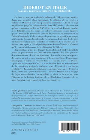 Cet ouvrage reconstruit la destinée italienne de Diderot à part entière. Après une première phase importante de diffusion de sa pensée, la fortune de Diderot a subi les ravages des courants cléricaux anti-Lumières. Ce n'est que dans les années 1960 qu'il y eut une réviviscence de sa philosophie. La civilisation italienne contemporaine a donc aussi, parmi ses "pères fondateurs", ce Diderot qui a été jugé de façon contradictoire, sinon oublié.