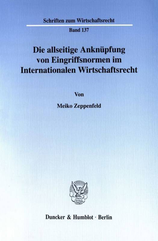 Meiko Zeppenfeld vertritt demgegenüber die These, daß auch für die Bestimmung des anzuwendenden Wirtschaftsrechts allseitige Kollisionsnormen klassischer Prägung herangezogen werden können. Die strukturelle Eingliederung des internationalen Wirtschaftsrechts in das herkömmliche IPR würde insbesondere zu mehr Rechtssicherheit und einer erhöhten Vorhersehbarkeit gerichtlicher und administrativer Entscheidungen führen - Gesichtspunkten, denen im internationalen Wirtschaftsrecht eine kaum zu überschätzende Bedeutung zukommt. Die Möglichkeit allseitiger Kollisionsnormen im internationalen Wirtschaftsrecht wird an Beispielen u.a. zum Außenwirtschafts-, Kartell- und Anlegerschutzrecht illustriert.