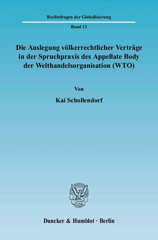 Kai Schollendorf untersucht, mit Hilfe welcher Methoden das höchste "Schiedsgericht" der Welthandelsorganisation (WTO) völkerrechtliche Verträge auslegt. Im ersten Teill stellt er zunächst die in Wissenschaft und völkerrechtlicher Praxis entwickelten Methoden der Vertragsauslegung dar. Anschließend weist er nach, daß diese Methoden, die Eingang in Art. 31 und 32 der Wiener Vertragsrechtskonvention gefunden haben, zum Bestand des Völkergewohnheitsrechts zählen.